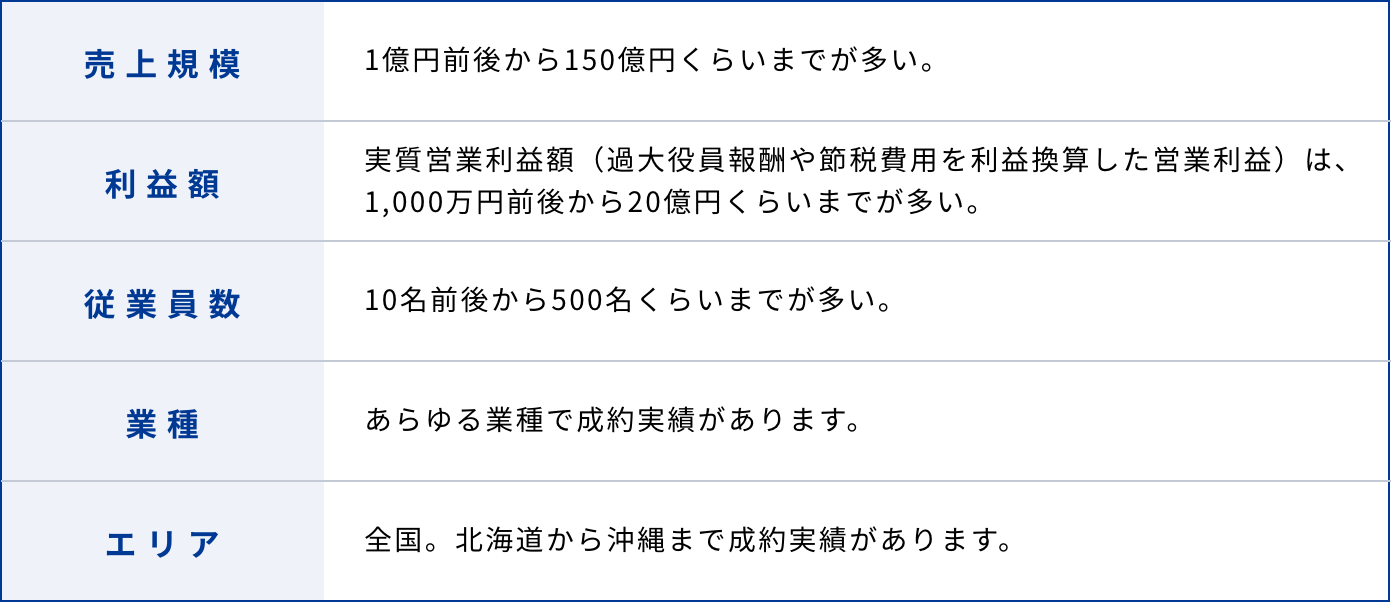 これぐらいの規模の会社を対象として、毎月相当数のM&A成約実績がある国内のM&A仲介会社は、弊社を含めて数社程度しかありません。