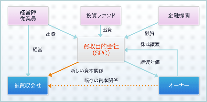 まず、経営陣とMBOパートナー(投資ファンド等)の出資により、買収目的会社(SPC)を設立します。次に、金融機関と交渉し、買収契約が締結された時に、被買収目的会社の資産を担保として、SPCが必要金額の融資を受けることができるように内諾をもらいます。買収契約締結後、SPCは、金融機関からの 融資額とファンド・経営陣からの出資金を用いて、オーナーより株式を買い取ります。最終的にSPCと被買収会社は合併し、SPCの借入金は、被買収会社の債務となります。