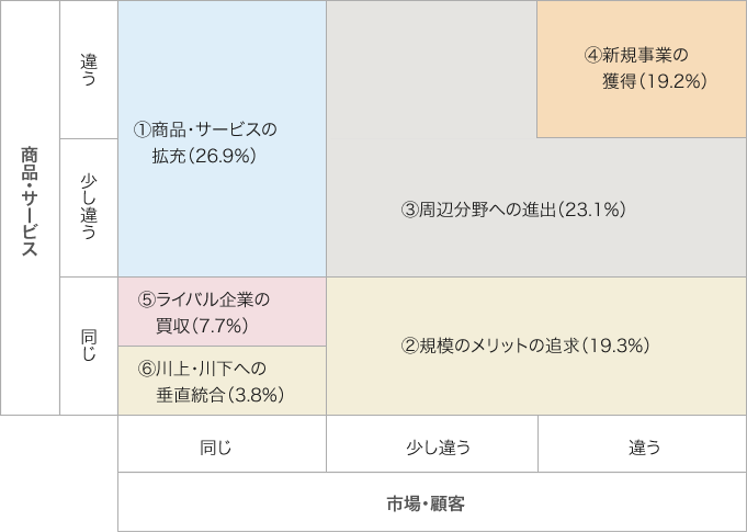 買収対象会社の「商品・サービス」および「市場・顧客」が自社と同じか異なるかによって、買収目的は以下の6つに分類されます。